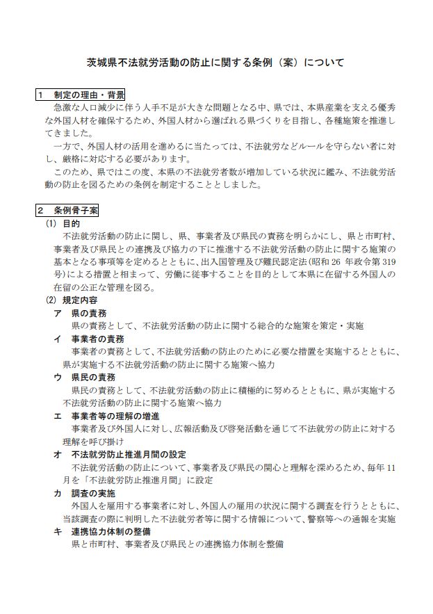 茨城県不法就労活動の防止に関する条例(案)に関する意見募集について